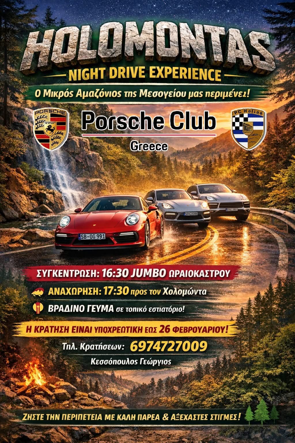 🌲 Holomontas Night Drive Experience 01/03/2026 Ο Μικρός Αμαζόνιος της Μεσογείου μας περιμένει! Κυριακή 1 Μαρτίου. Η Βόρεια Ελλάδα φοράει το πιο βαθύ της πράσινο και εμείς της απαντάμε με μια απογευματινή οδηγική εμπειρία που συνδυάζει ρυθμό, φύση και αυθεντική γεύση. ΠΡΟΓΡΑΜΜΑ : https://cms.porsche-clubs.com/PorscheClubs/pc_hellas/pc_main.nsf/web/C1256FAC0059021CC12570E0004B285C 📌 Η κράτηση είναι υποχρεωτική έως 26 Φεβρουαρίου 📞 Τηλέφωνο κρατήσεων: 6974727009 👤 Υπεύθυνος: Κεσσόπουλος Γεώργιος